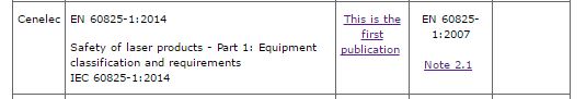 2017年12月31日最后一欄中的數字是指可交付成果到期的日期,很快就會有消費者激光器的特定安全標準,這意味著超出另一個安全指令(如LVD)范圍的激光產品將需要符合特定的激光安全標準才能符合GPSD。